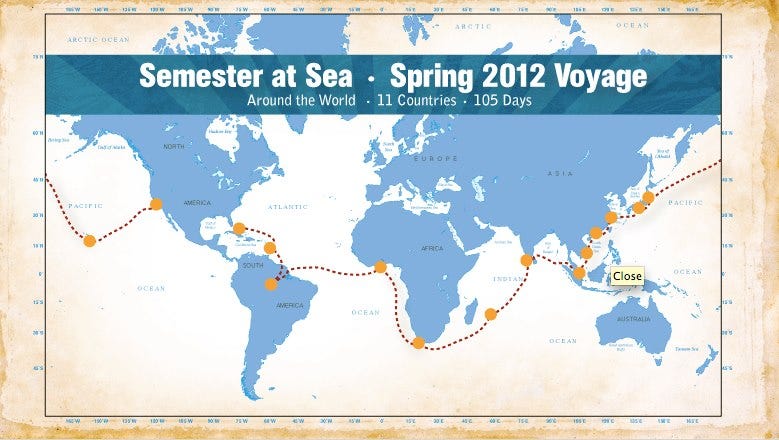 In college, I was determined to study abroad. I had taken French for most of my life and was set on spending a semester smoking cigarettes and eating croissants on cobblestone streets. To increase my odds of making this dream a reality, I applied to five different programs—four in France and one called Semester at Sea, which a friend had casually mentioned in passing.